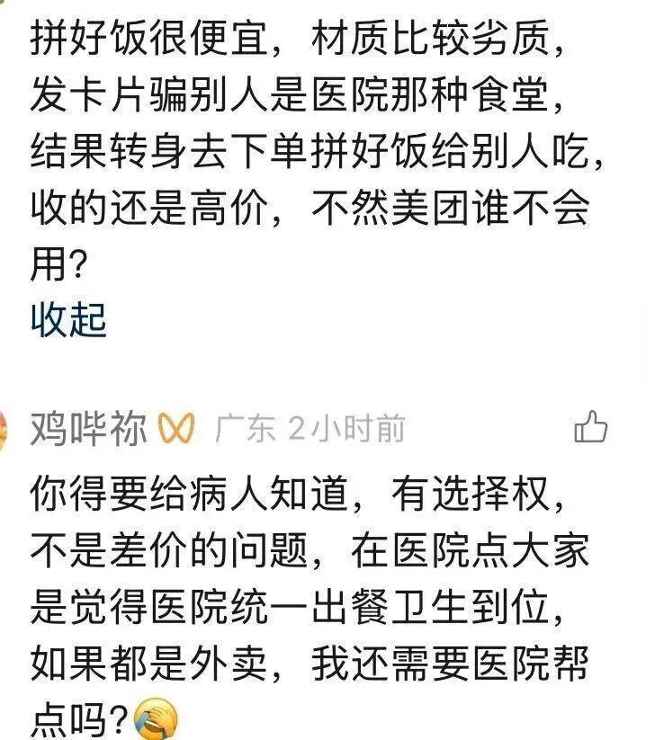 视频发出后,引发了网友热议。有网友梳理了事情经过:无良商家将自己制作的点餐小程序二维码印成传单,派人直接送到医院的各个病房。病人通过扫描传单下单支付了15元后,商家立刻转身在“拼好饭”平台上,用仅仅8.9元的价格为病人下单了同样的餐食。就这样,通过这种“无货源”的模式,商家动动手指,就轻松赚取了6.1元的差价。